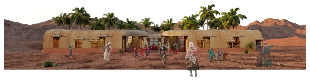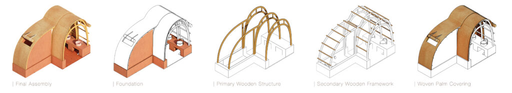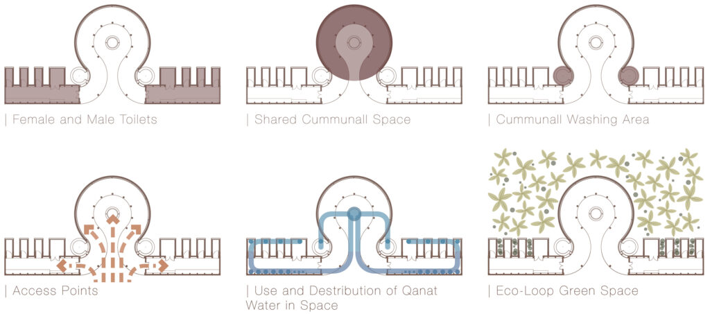 The design draws from two locally embedded systems: the qanat and the kapar. Qanats represent a long-standing ethic of water stewardship based on low-energy systems, collective use, and respect for limited resources. Kapar construction, on the other hand, embodies a lightweight, climate-responsive shelter logic developed through local materials and knowledge. These references are not symbolic; they actively inform the project’s spatial organization, construction approach, and environmental strategies.