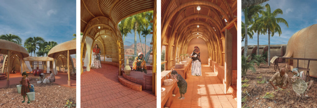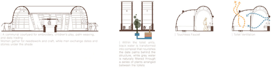 Environmental performance is achieved through an integrated and closed-loop water strategy. Blackwater is composted and reused to support date palms, transforming waste into a productive landscape resource. Greywater from washing areas is filtered through planted beds before being reused or safely absorbed by the ground. Through this system, water consumption is reduced, infrastructure demands are minimized, and sanitation becomes directly connected to landscape and ecology.